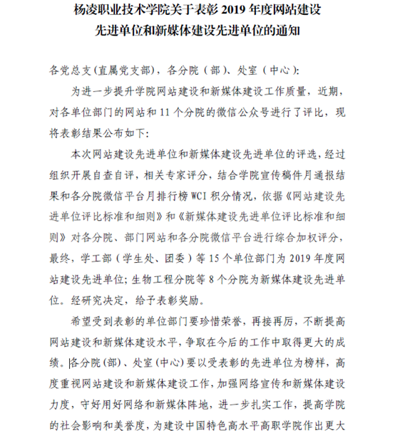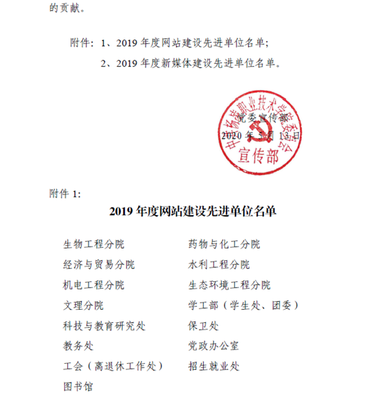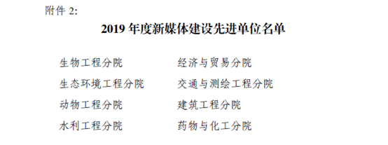 2020年5月13日学院宣传部发文,表彰了2019年度网站建设先进单位和新媒体建设先进单位,生物工程分院网站建设及新媒体建设均被评为先进单位。