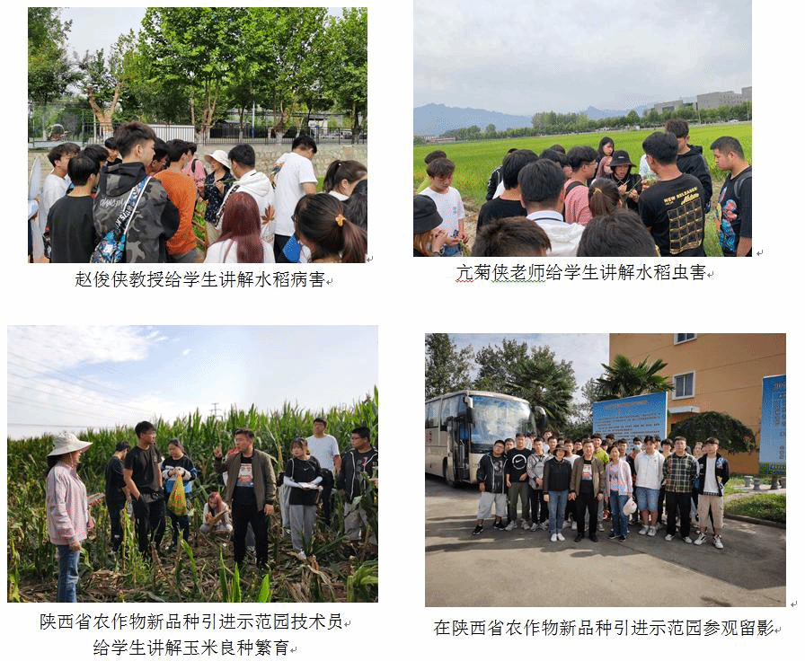 实习分为校内校外两部分,校外带领学生对长安县东大镇的水稻实验基地的病虫害进行了田间调查,并在地处杨凌的陕西省农作物新品种引进示范园查看了不同品种的玉米、大豆等作物上的病虫害。示范园的技术员小王是生物工程分院食品专业2010级的毕业生,对作物新品种引进繁育中的田间试验、小区划分、数据统计与分析等知识给学生做了现场讲解,让学生认识到了课堂知识在实践中的应用,也让学生切身感受到了专业知识的重要性。
