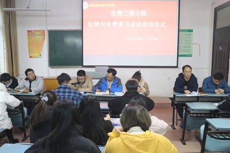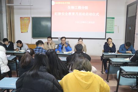 为了强化学生安全纪律意识,增强学生自律守纪能力,促进学生良好行为习惯养成,进一步优化校园环境,保障校园安全稳定,营造良好的育人环境,着力构建优良校风学风,提升学生的教育管理效果,生物工程分院于12月7日下午5点在林和楼146举行2020年纪律安全月活动启动仪式。