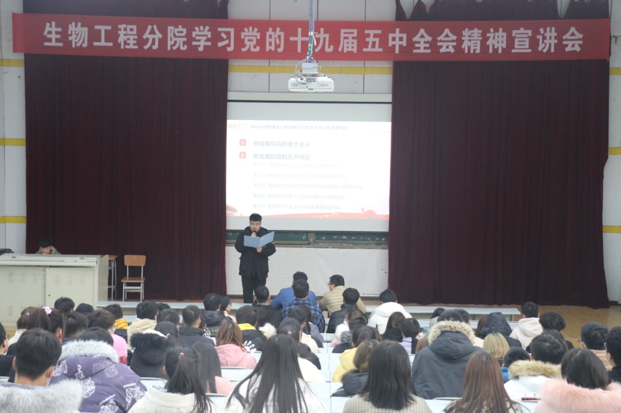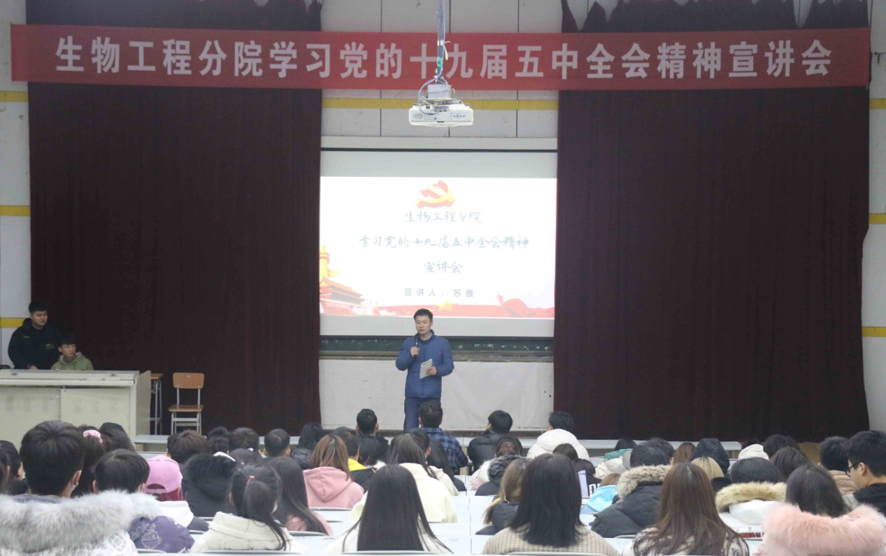 为贯彻落实十九届五中全会精神学习,按照学校团委的统一安排部署,生物工程分院于2020年12月14日下午,在西校区台阶教室进行十九届五中全会精神宣讲会,团总支书记贺立虎,辅导员薛元夏及全体学生参加此次宣讲。