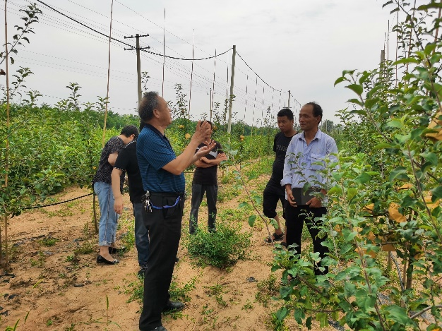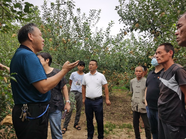 此次出征前,调研团队就了解到村民朱广继成立合作社,承包300亩地种植从西农引进的“瑞雪”苹果新品种,两年来病虫害滋生严重,即将结果的幼树面临重大问题。针对该情况,团队特邀对苹果树病虫害防治有着多年实践经验的康克功教授一同前往,康教授通过田间调查和咨询,对果树病虫害种类、发病原因等作了全面分析,并结合果树生长环境和水肥管理情况,在田间地头给种植户上了一堂生动的技术培训课,为农户提供了一套完整的苹果病虫害防治方案。