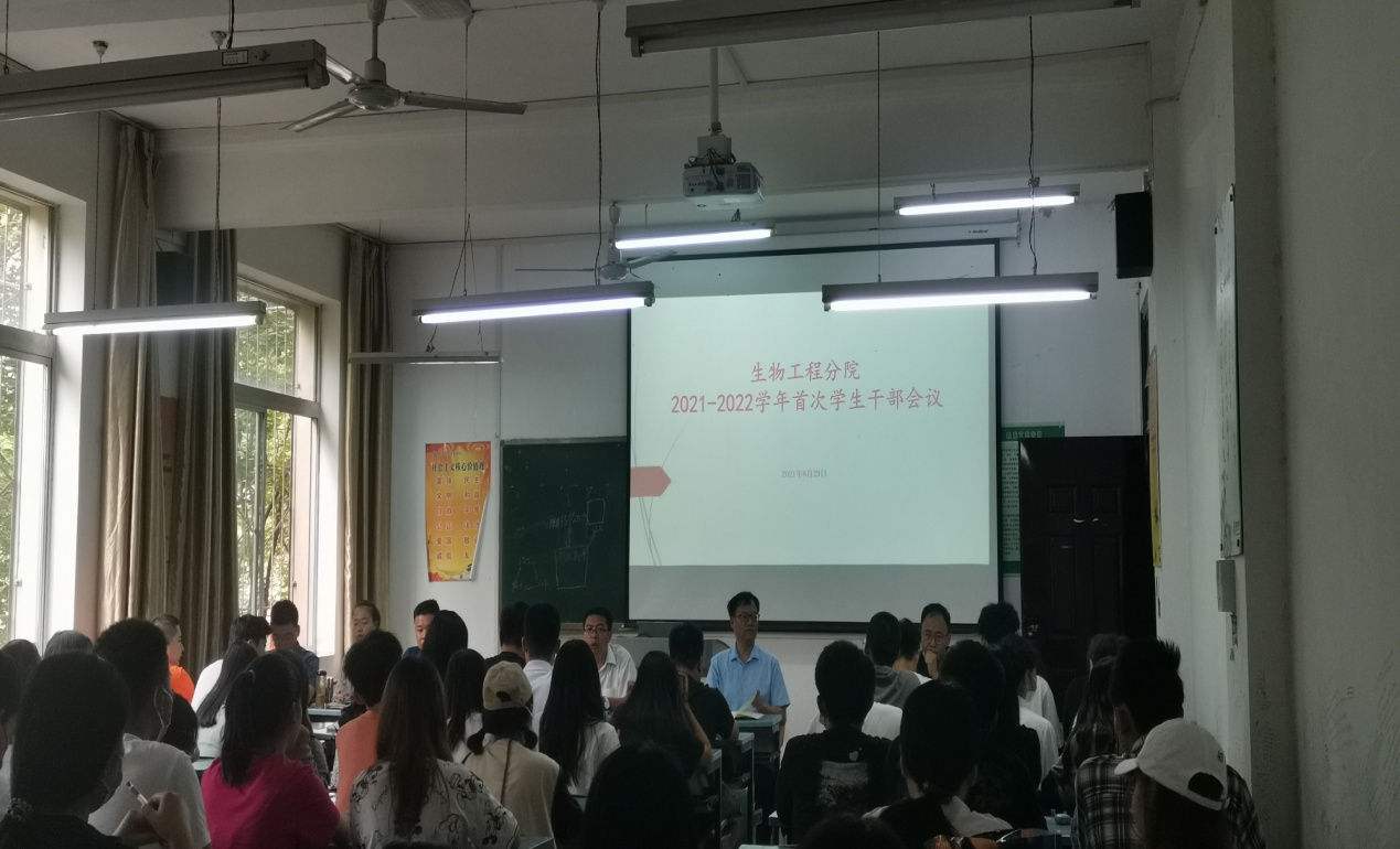 8月29日下午,beat365在林和楼146教室召开2021-2022学年首次学生干部会议。生物工程分院党总支书记、学工办主任、全体辅导员、团总支学生会各部门负责人及2020级、2019级各班班团干部参加了本次会议。