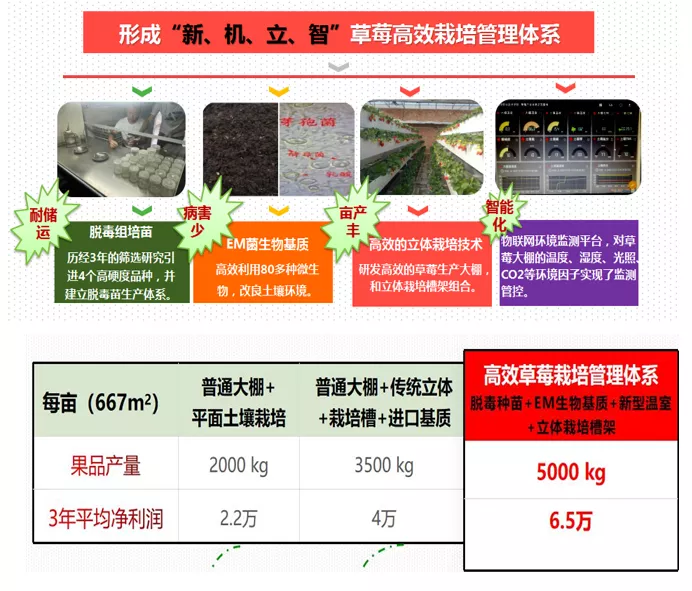经过3年的应用研究,杨振华带领团队建立了草莓“新・机・立・智”高效栽培管理应用体系。