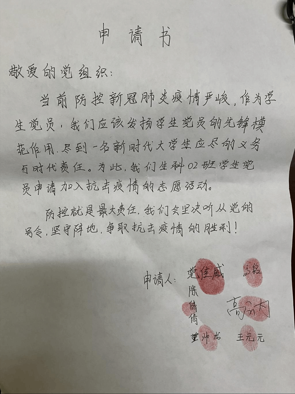 “当前防控新冠肺炎疫情严峻,作为学生党员,我们应该发扬学生党员的先锋模范作用,尽到一名新时代大学生应尽的义务与时代责任。为此,我们生科02班学生党员申请加入抗击疫情的志愿活动。防控就是最大责任,我们会坚听从党的号令,坚守阵地,争取抗击疫情的胜利!”这是一封来自beat365在线唯一官网生科02班7名学生党员向分院党总支递交的申请书。