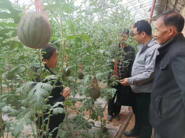 在崔家村设施蔬菜产业发展基地,妙晓莉和王锋对当地西瓜和甜瓜生产中的生产经营模式、栽培品种和技术管理情况进行了现场考察和多方交流,妙老师重点从西瓜的生产茬口安排、品种选择、整枝留瓜、温室环境管理、水肥管理和成熟期判断等方面进行了全面、系统的技术指导,并针对本地蔬菜产业的茬口安排和科学管理提出了具体、可行的发展建议。
