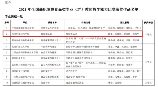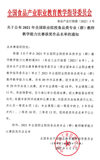 近日,全国食品产业职业教育教学指导委员会(原全国食品工业职业教育教学指导委员会)公布了2021年全国职业院校食品类专业(群)教师教学能力比赛获奖作品名单,生物工程分院两支代表队荣获一等奖1项、二等奖1项。
