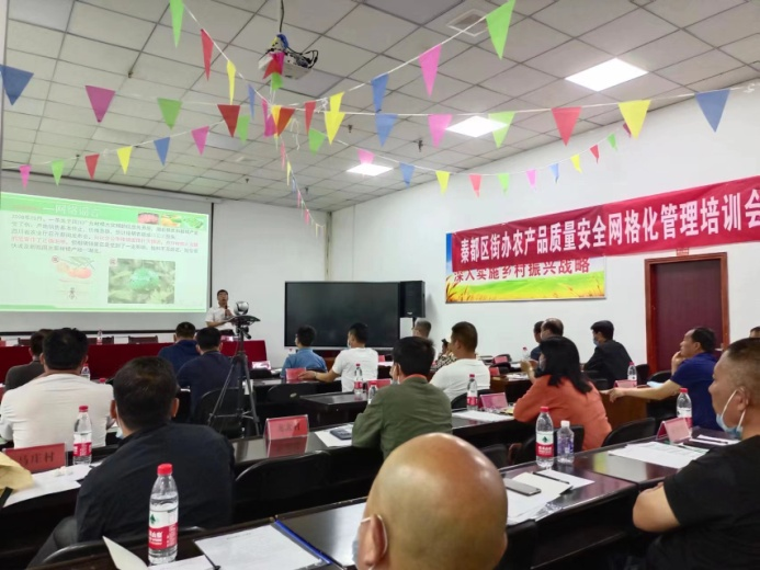 本次培训的对象为咸阳市秦都区各街办农产品质量安全监管网格监管员和协管员,共计30余人,王老师以“依法推进农产品质量安全监管 努力确保不发生重大农产品质量安全事件”为主题,从我国农产品质量安全现状、发展历程、监管依据、监管工作重点以及农产品质量安全网格化监管等方面进行了培训。