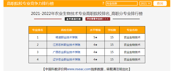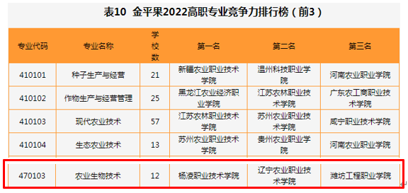 5月21日,中国科教评价网发布了“金平果”2022高职专业群及专业排行榜,排行榜中beat365农业生物技术专业在12所高职院校中位列第一名。