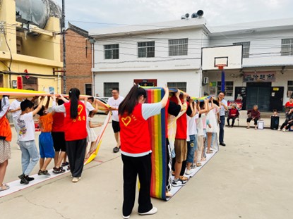 随后,志愿服务团队与孩子们一起进行团体素质拓展活动,活动分为四个板块:击鼓传花、无敌风火轮、穿越呼啦圈、同舟共济。