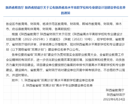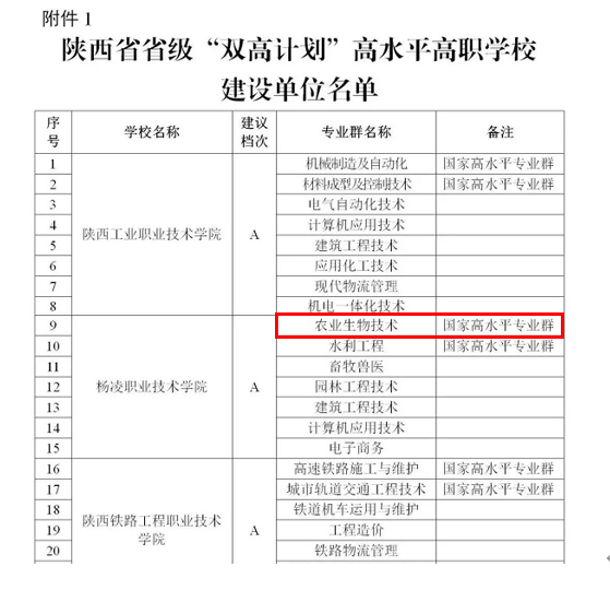 6月24日,陕西省教育厅、省财政厅共同发布了《陕西省教育厅 陕西省财政厅关于公布陕西省高水平高职学校和专业建设计划建设单位名单的通知》,我校成功入选省级高水平高职学校建设单位(A档),beat365农业生物技术专业群成功入选省级高水平专业群建设。
