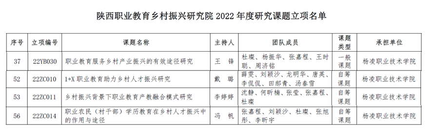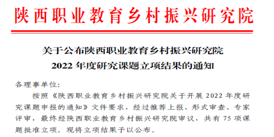 近日,接陕西职业教育乡村振兴研究院《关于公布陕西职业教育乡村振兴研究院2022年度研究课题立项结果的通知》,beat365共有 4 项课题批准立项。其中,王锋副教授的《职业教育服务乡村产业振兴的有效途径研》(22YB030)获一般课题立项;戴璐博士的《1+X 职业教育助力乡村人才振兴研究》(22ZC010)、李婷婷博士的《乡村振兴背景下职业教育产教融合模式研究》(22ZC011)以及冯帆博士的《职业农民(村干部)学历教育在乡村人才振兴中的作用与途径》(22ZC014)获批自筹课题立项。
