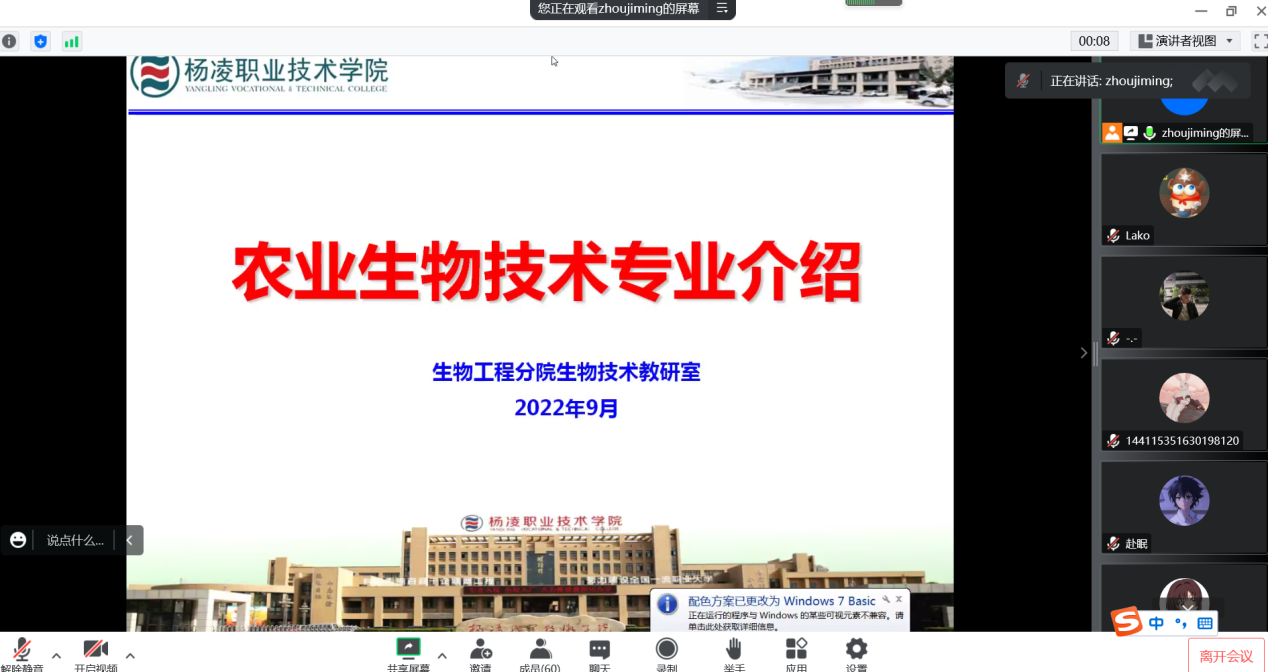 9月23日上午,生物工程分院生物技术教研室开展了2022级新生线上专业介绍会。根据我校疫情防控工作总要求,本次新生入学专业介绍采用线上直播方式,由教研室主任周济铭教授主持,对生物科学(本科)、农业生物技术(专科)两个专业分两个会场进行了详细介绍,生技教研室全体教师参加会议。