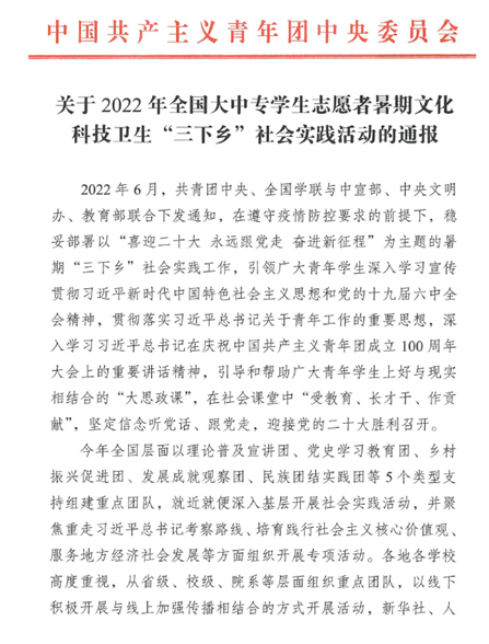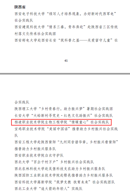 10月11日,共青团中央表彰了2022年全国大中专学生志愿者暑期文化科技卫生“三下乡”社会实践活动的优秀单位、优秀团队、优秀个人和优秀品牌项目名单,杨凌职业技术学院beat365在线唯一官网“情暖童心”社会实践队荣获2022年全国“三下乡”社会实践优秀团队,这是学校在“三下乡”社会实践活动方面首次获得的国家级团队荣誉。