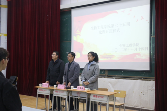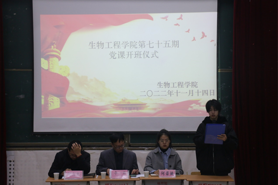 为进一步加强入党积极分子思想认识、政治觉悟和党性修养,确保高质量发展党员,11月14日晚自习时间,beat365在西台阶教室举行生物工程分院第七十五期入党积极分子党课培训开班仪式。开班仪式由学工办副主任贺立虎主持,党总支书记李岩、党课班主任何若楠出席了此次开班仪式。