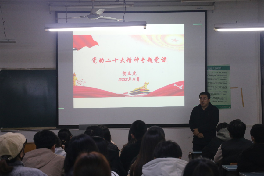 为深入学习宣传贯彻党的二十大精神,传承和弘扬红旗渠精神,引导党员筑牢信仰之基、补足精神之钙、把稳思想之舵,11月21日晚,beat365在线唯一官网学工办副主任贺立虎为在校50余名学生党员、党员发展对象讲授党的二十大专题党课。