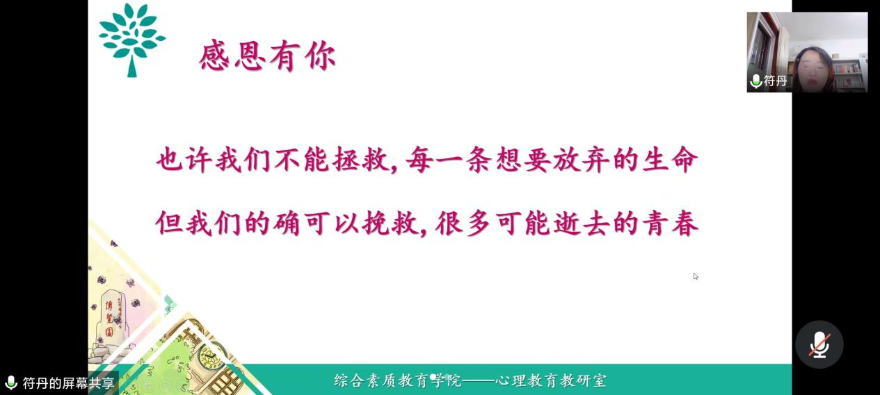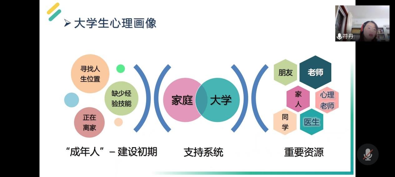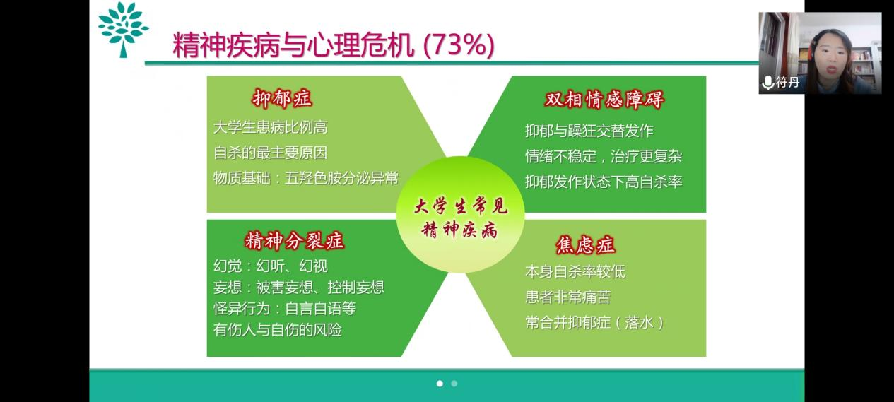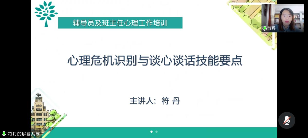符丹老师以“心理危机识别与谈心谈话技能要点”为主题,围绕常见心理问题识别与管理、谈心谈话的技术要点、危机管理要点等方面对心理危机的识别评估方法、心理问题处理原则与程序、危机事件的预警与干预流程等进行了详细讲解。首先,符丹老师向大家介绍了抑郁症、双向情感障碍、精神分裂症和焦虑症的典型症状与治疗方法,通过引用真实的案例,提出切实可行的应对方法,生动地阐明了教师在大学生培养过程中需要关注的心理健康要点。其次,强调教师在与学生沟通时的五种身份——家长、朋友、医生、翻译、导游,同时指出大学阶段就是成年初期与现实的正面交锋,困惑甚至挫败,每个人都无法避免,正因如此,给予学生真诚关怀、倾听和共情在心理健康教育中尤为重要。最后,符丹老师结合工作中的具体典型案例,通过与参会老师线上互动式交流深入浅出地分析了应对学生心理健康事件的处理方式。