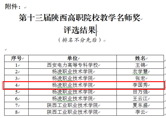 近日,省教育厅公布了关于表彰第十三届陕西高职院校教学名师奖获奖教师的通知,生物工程分院李国秀教授获评第十三届陕西高职院校教学名师奖。