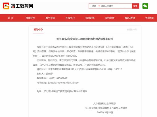 据悉,根据《关于开展2022年全国技工教育规划教材推荐遴选工作的通知》(人社职司便函〔2022〕62号)安排部署,经有关单位申报、形式审查、专家评审等程序,此次共遴选出210本教材。