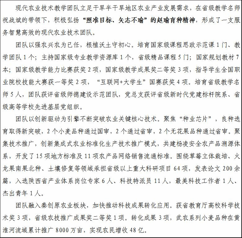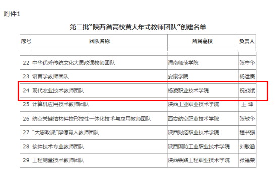 近日,经高校推荐、资格审核、评前公示、专家评选,陕西省教育厅第二批“陕西省高校黄大年式教师团队”认定结果公布,全省共有29个教师团队入选,其中beat365祝战斌教授负责的“现代农业技术教师团队”入选。