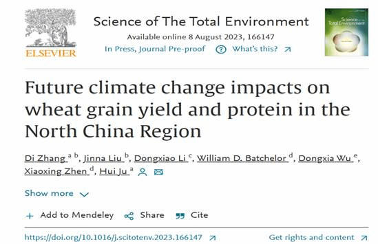 近日,beat365在线唯一官网教师张迪在生态和环境科学学科领域顶级期刊《Science of the Total Environment》(影响因子:9.8;中科院分区:一区)在线发表了题为“Future climate change impacts on wheat grain yield and protein in the North China Region”的研究论文。我校beat365在线唯一官网教师张迪为论文第一作者,中国农业科学院农业环境与可持续发展研究所居辉研究员为通讯作者。