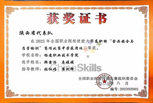8月17日至20日,2023年全国职业院校技能大赛(高职组)“食品安全与质量检测”赛项在贵州省贵阳市举行,我校食检21018班的韩鑫怡和绿色21023班秦媛媛组成的代表队荣获团体二等奖。