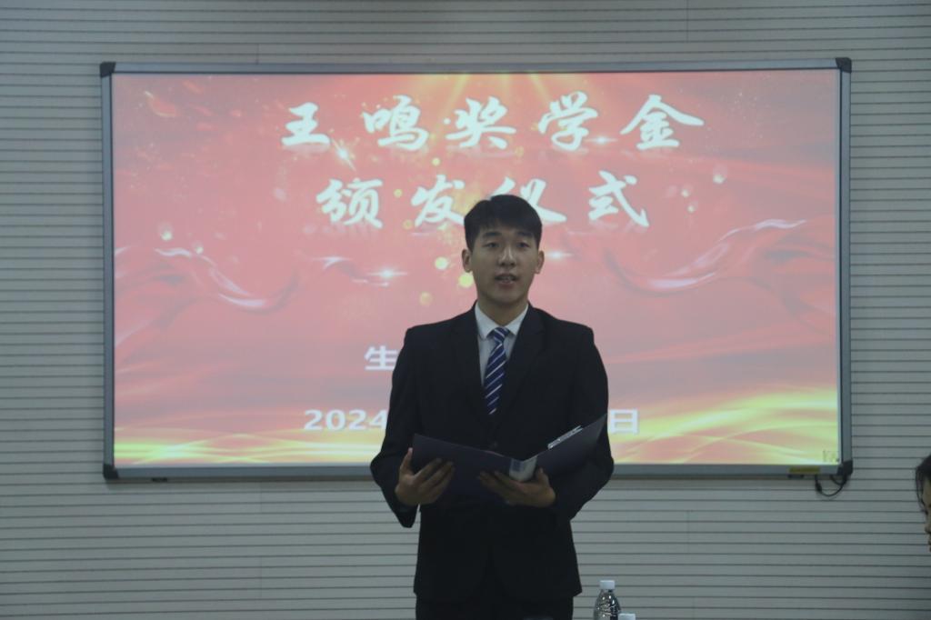 获奖学生代表李腾飞发言,他表示今天收获的不仅是荣誉,更感受到了领导、老师对我们的美好期望,感受到了王鸣教授对涉农学子的厚爱和关怀。我们定会以此为动力,持之以恒,向着自己的人生目标迈进,立志成才,将爱心的接力棒传递下去,以实际行动建设家乡,回报社会。