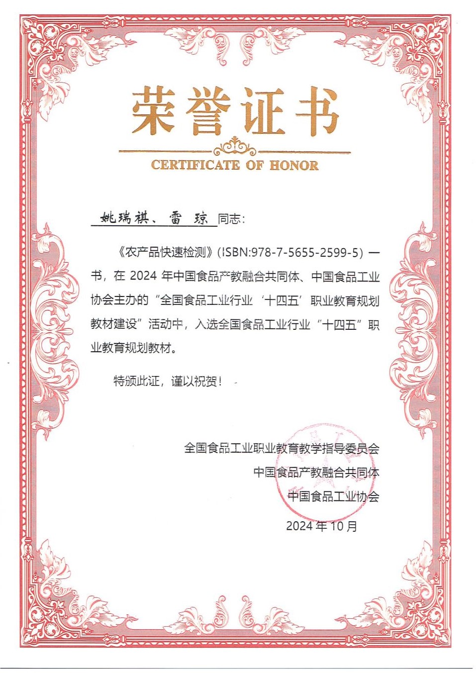 近日,中国食品工业协会和全国食品工业职业教育教学指导委员会联合公布了“全国食品工业行业'十四五’职业教育规划教材”名单,beat365教师姚瑞祺、雷琼主编的《农产品快速检测》成功入选。